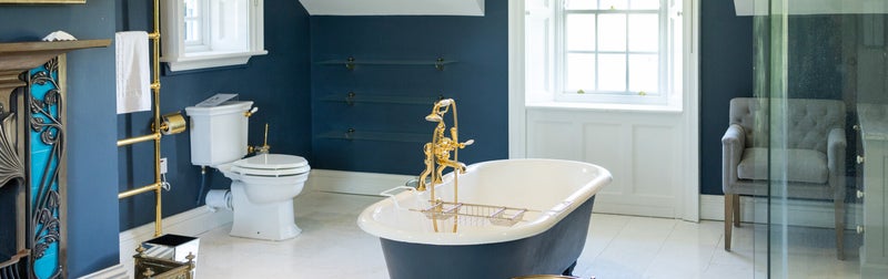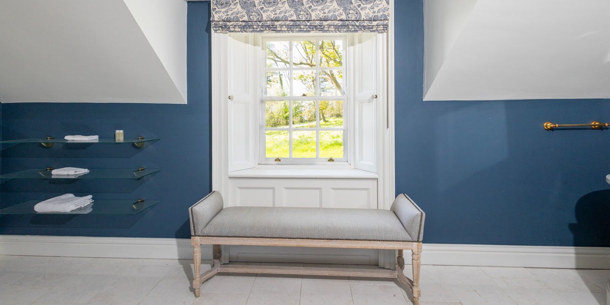 The nautical theme pays tribute to the Titanic using timbers from the Harland & Wolff Shipyard and his and hers Belfast sinks overlooking The Alpine Garden, beside a wonderfully upholstered window seat.