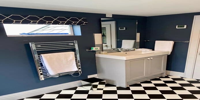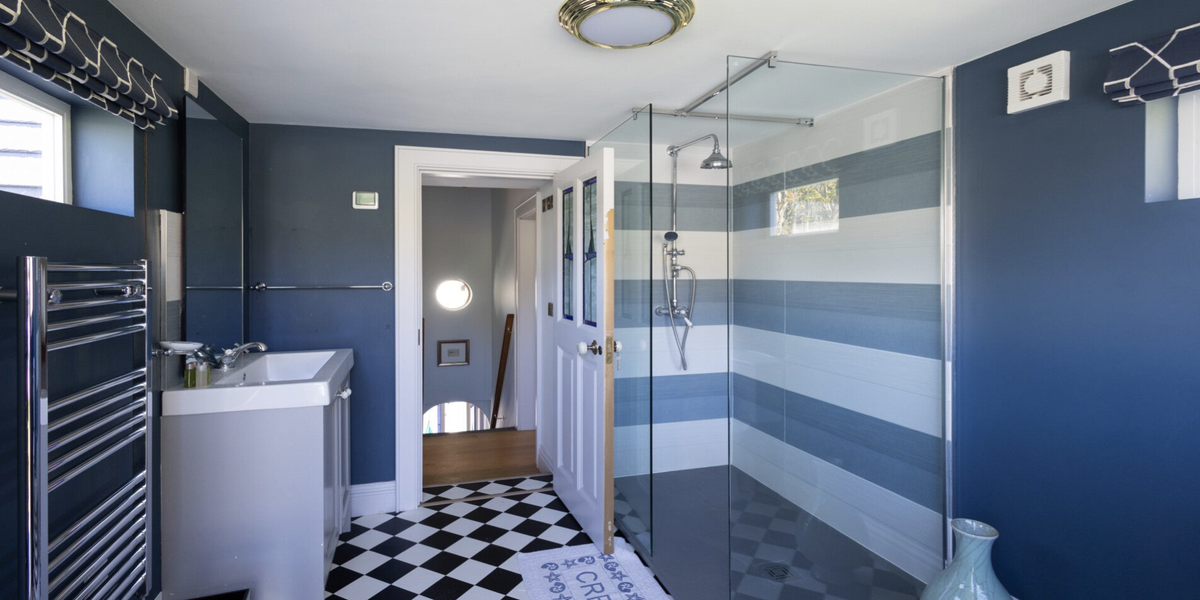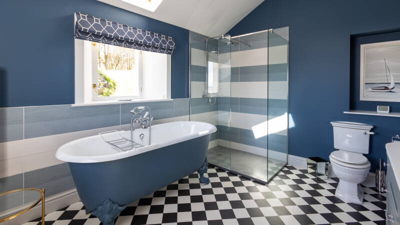 The main Bathroom, painted a Stiffkey Blue, has a massive Victorian roll top bath, state of the art rain shower, and heated mirror. The second Bathroom, upstairs, is also painted a Stiffkey blue, also has a state of the art rain shower and heated mirror.