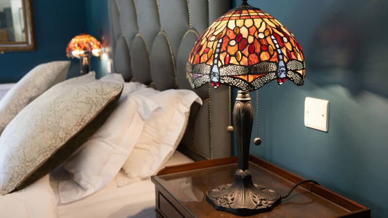 The decorations include light fittings by Tiffany: Louis Comfort Tiffany founded the Tiffany Glass and Decorating Company in 1885. Tiffany drew inspiration from ancient Roman glass when creating coloured glass designs without the use of paint or enamel.